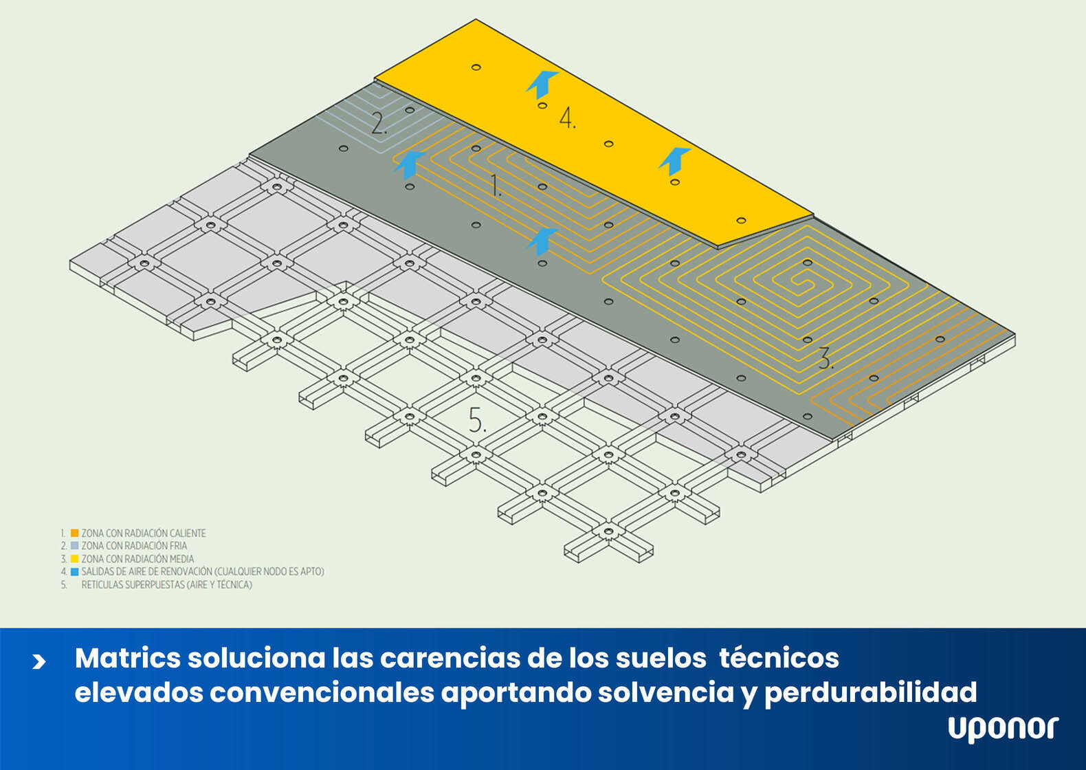 “If raised floor Matrics system also incorporates its network of air ducts and floor diffusers, the client solves all the air conditioning with a single product, consuming a minimum thickness. Working with Uponor provides the security of incorporating the advances in this type of facility that allow raised floor Matrics system to always be at the forefront”, affirms Daniel Díaz.