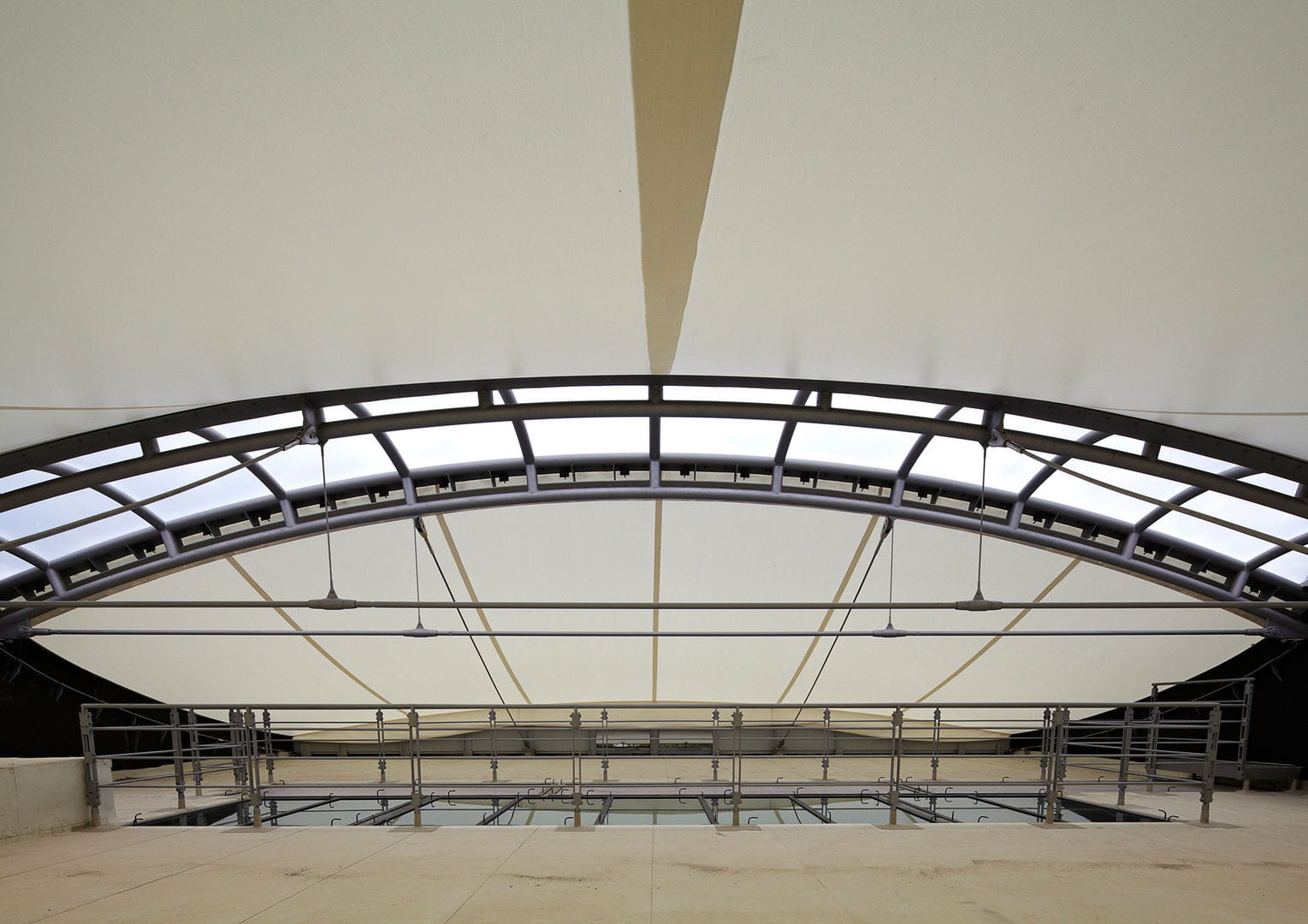Designed by Thomas Rampp, the 3,580 m2 building represents a real game-changer thanks to its bright roof membrane. The translucent outer skin spans the multi-layered roof superstructure, providing weather protection. The revolutionary membrane coating is one of several unusual concepts and products being used for the first time.