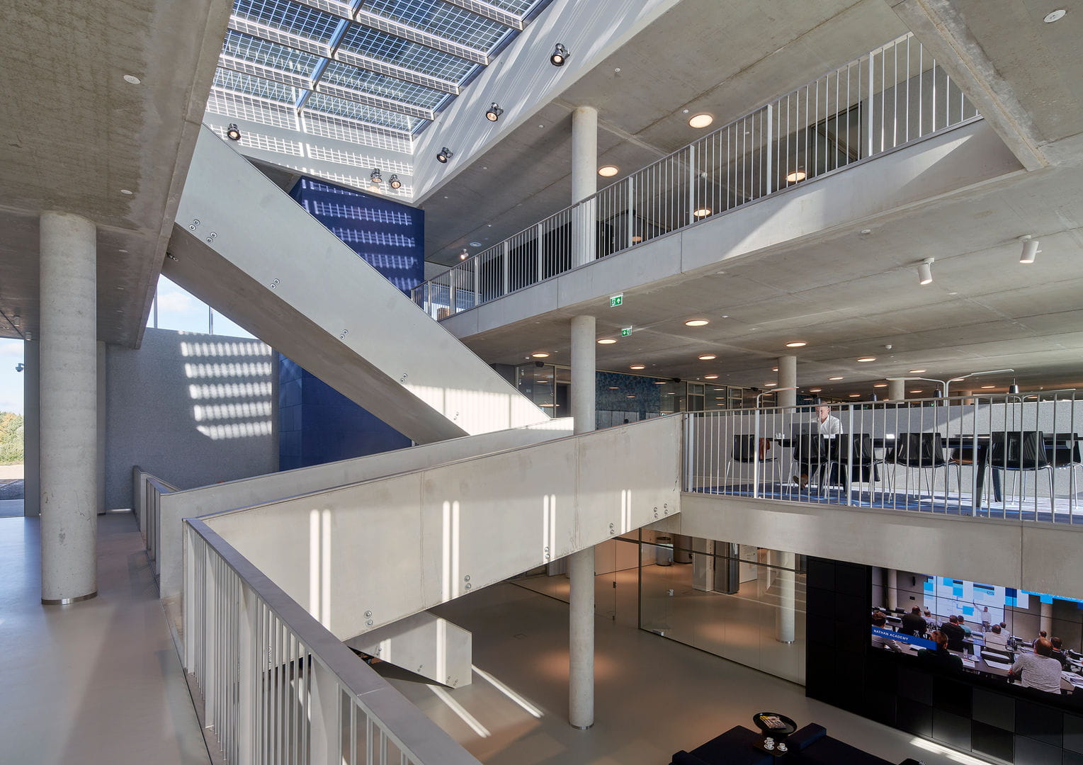 from the bridge over the railway you can't miss Nathan's new building. A sleek, modern building, designed based on the very latest in technical climate solutions. It represents the beating heart of Nathan, as a new office for employees, but above all as a knowledge and expertise centre for sustainable climate technology. The entire ground floor is reserved for the 500 m2 showroom and the education and training centre for the Nathan Academy.