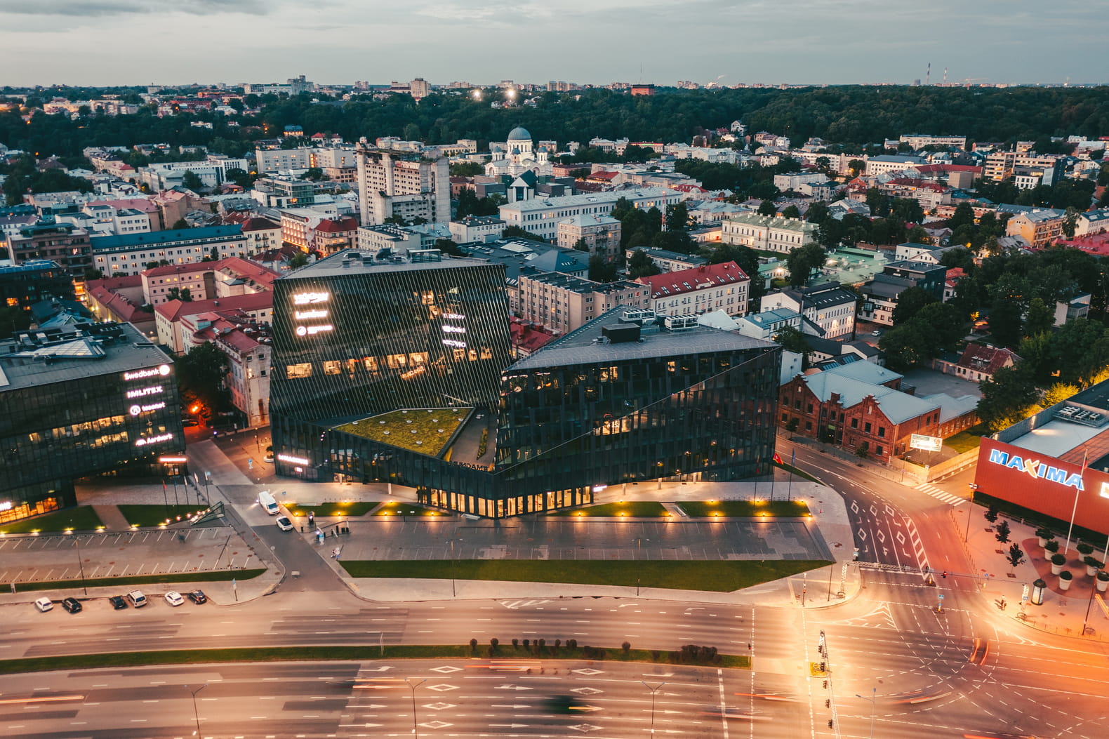 The business centre merges organically into the landscape of the banks of the Nemunas, beautifully blending with its natural surroundings.