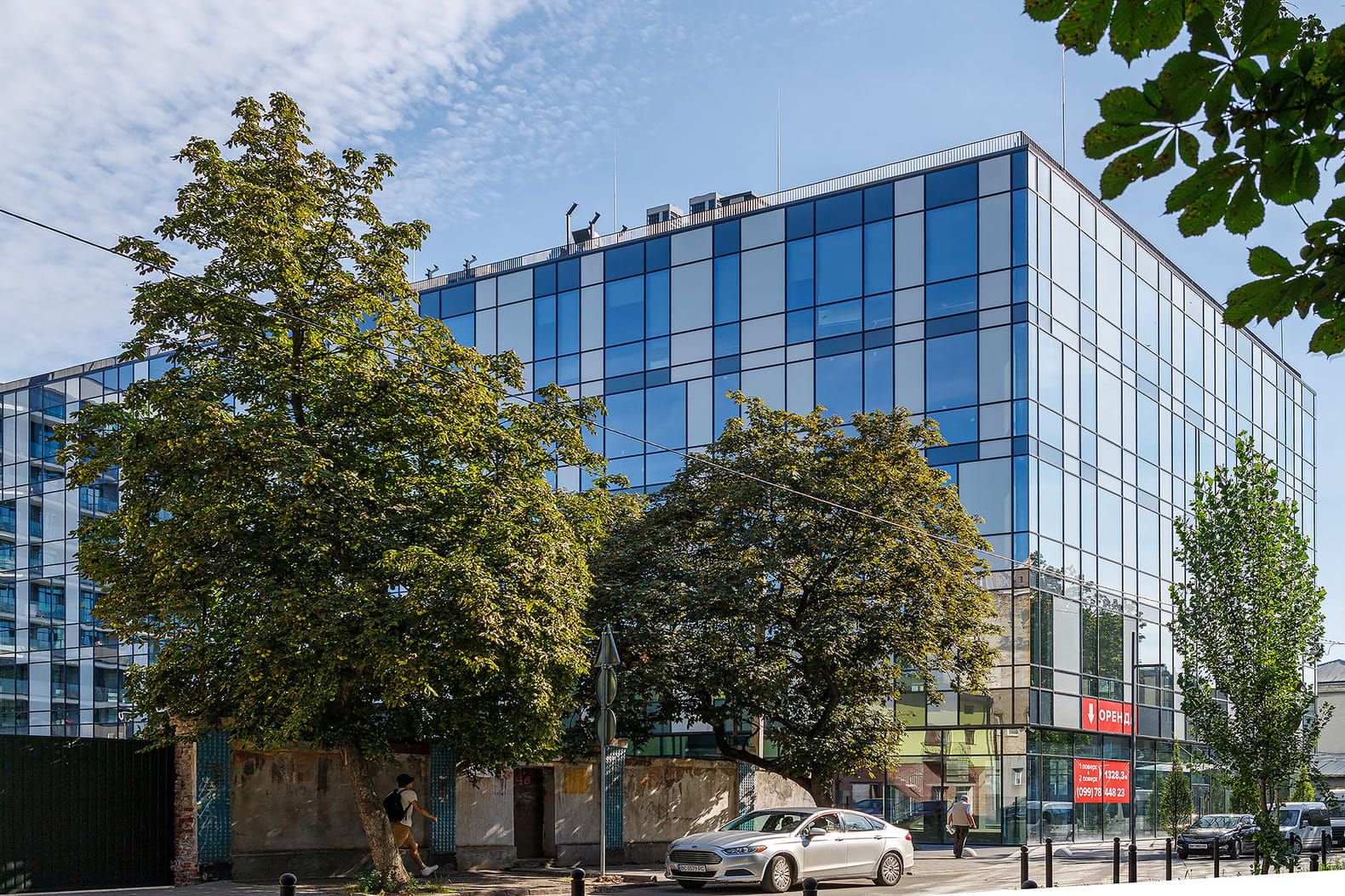 A modern five-story office center with a cozy atmosphere.