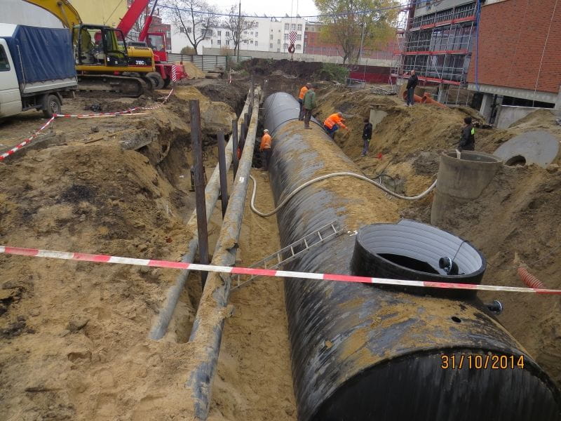 Uponor Infra delivered for this project 4 fire water tanks Weho of diameter dn3000mm, ring stiffness SN2, length of 11,15-32,84m and total capacity of 460m³. The tanks are to be used as a water reserve for the sprinkler system in the shopping mall and are filled from the municipal network. The water from the tanks is supplied to the pumping stations. The tanks are equipped with suction strainers, floating valves, liquid level sensors and emergency overflows. The individual segments of the tanks were installed under the extrusion welding method, carried out by Uponor Infra Service Group, ensuring the uniformity and tightness of the structure.