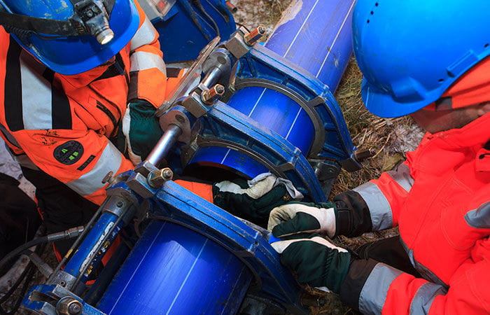 The relining job was split into 150–200 m portions based on the line's valves and branches. Paltamo-based Pyykkönen Yhtiöt Oy dug a total of 14 excavations at both ends of the relinings, and the new pipe was winched inside the old one by a lorry. Uponor Infra's fitters built the lines from 12-metre pipes by percussion welding.Relining began at the town end immediately after washing, and the line was taken into use gradually as work progressed. Water was already flowing through the front end within a couple of weeks. Only one property needed a temporary surface water pipe.