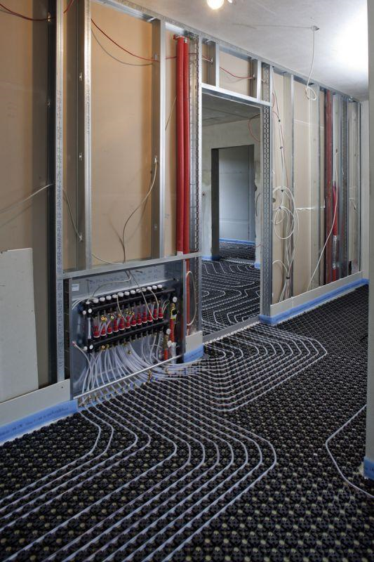 The heating pipes could be installed quickly by a single technician. Installers first placed the self-adhesive L-shaped edging, followed by the Minitec plastic spacing tiles directly onto the synthetic coated paper. “The spacing tiles feature an adhesive layer on the bottom. This guarantees a secure bond between the subfloor and the plastic tiles,” explained Klaus Schlepps, Sales Promoter for Uponor. The nubs on the tiles allow the high-pressure network of PE-Xa plastic piping to be laid in compliance with current standards. Directly on and between the nubs, the tiles are manufactured with a grid of punched holes placed at regular intervals through which the levelling screed can easily flow, allowing it to create a stable structure by bonding together with the heating system and subfloor. The surface is heated with fast warm-up times and quick temperature regulation at low temperatures in the heating water circuit. Individual room temperature control was achieved using a 24 V system with a C-35 regulator and T-35 room temperature sensors from Uponor.