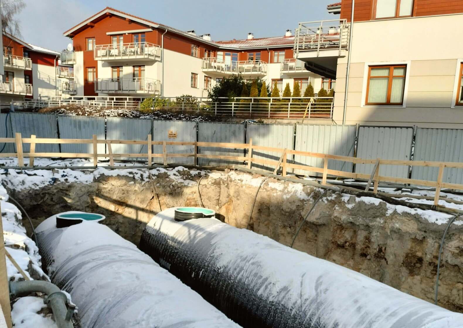 Uponor Infra has delivered PE SN8 DN2400 retention tanks with a total capacity of V = 510m3 to the Neptun Park estate, which will collect stormwater from the estate. The parts of individual tank batteries were connected to each other using a tee and a DN2400 cross-piece. DN1200 SN4 centric chimneys with aluminum ladders were installed on the tanks. After installing the tanks, the Uponor Infra service group performed simplified tightness tests of the tanks, with air in the profile, which do not require filling the tanks with water. This shortens the time required for collection and eliminates the costs associated with filling and emptying such large tanks with water.