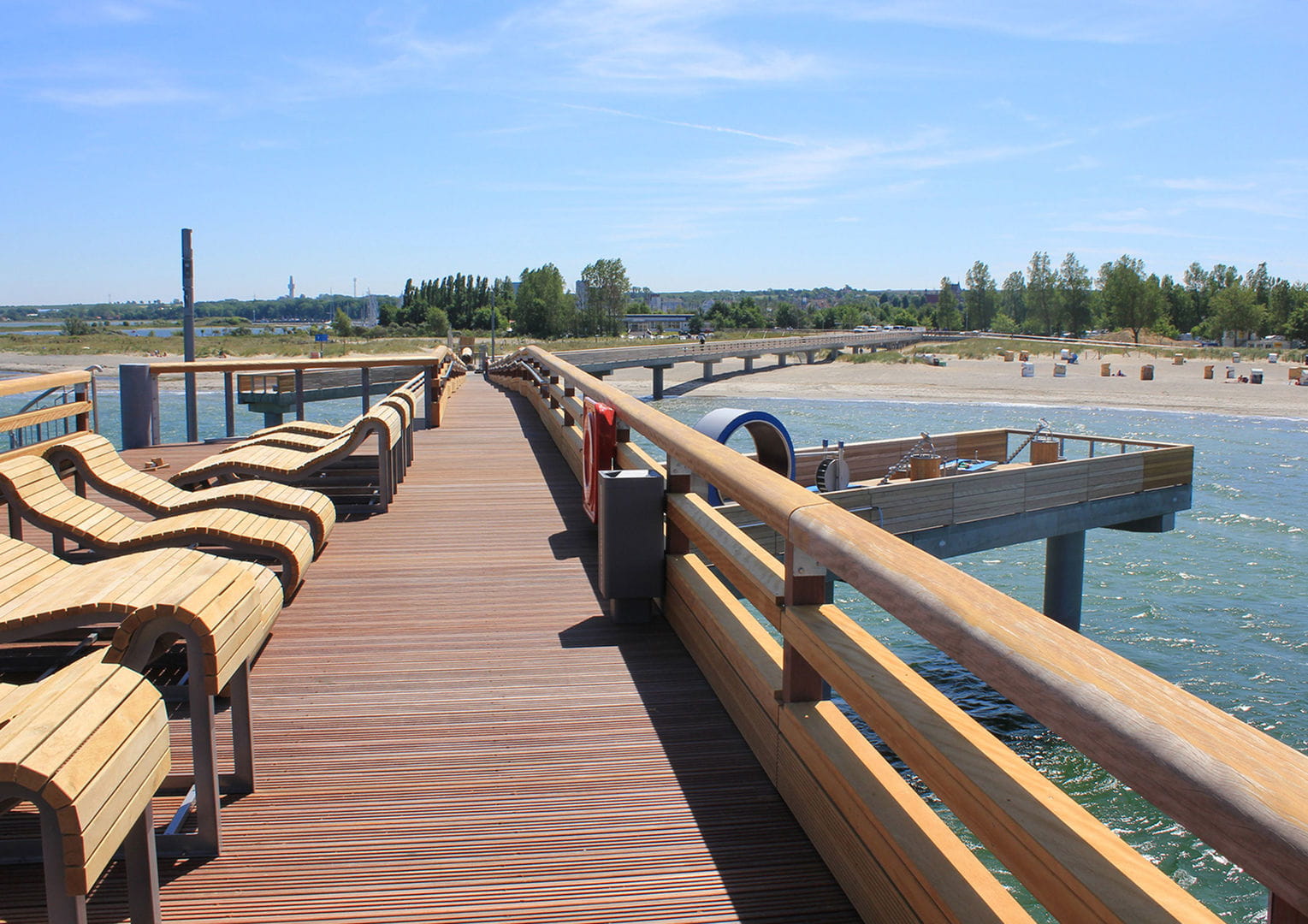 Heiligenhafen, the holiday town on the Baltic Sea, has had a new attraction since 2012: The Adventure Pier [Erlebnis-Seebrücke].