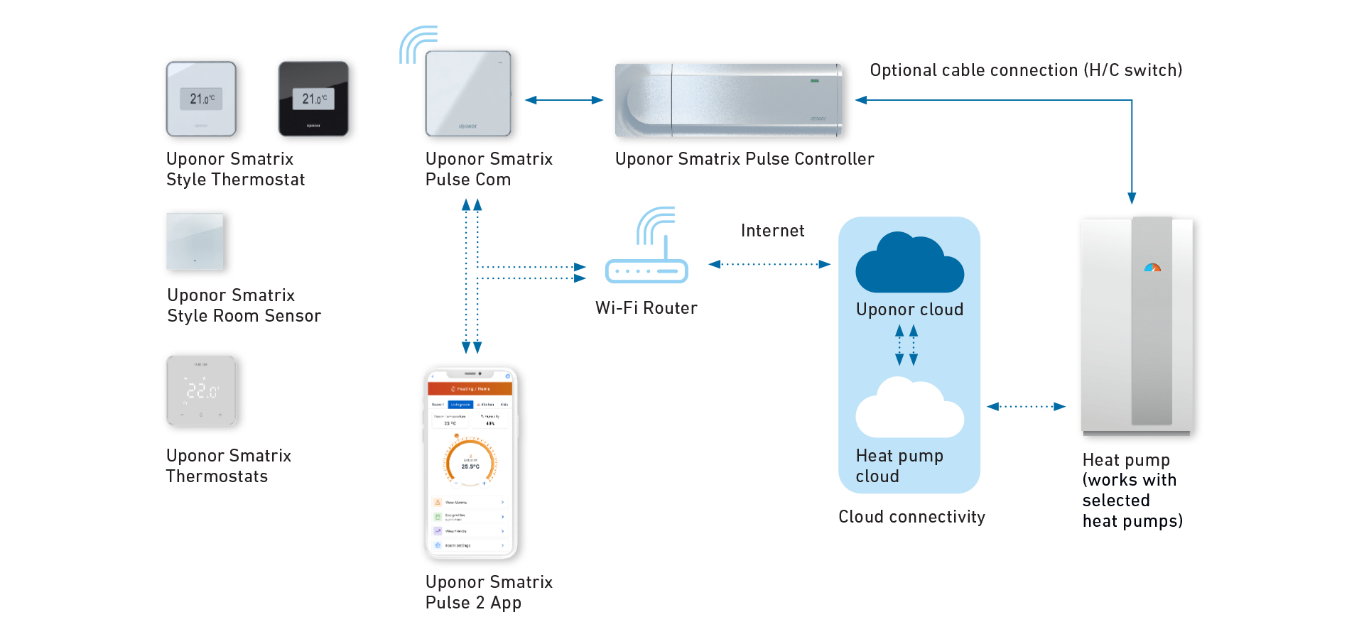 Uponor Smatrix AI révolutionne la régulation du chauffage par le sol en intégrant l'intelligence artificielle pour prédire, adapter et optimiser la puissance de chauffage. La connexion transparente à la pompe à chaleur via l'intégration cloud-to-cloud assure des temps de réponse rapides, une configuration sans effort et une efficacité énergétique maximale. En tenant compte des prévisions météorologiques, des paramètres du bâtiment et des préférences de l'utilisateur, Smatrix AI adapte en permanence la puissance de chauffage, garantissant ainsi une température ambiante adéquate en toute saison.