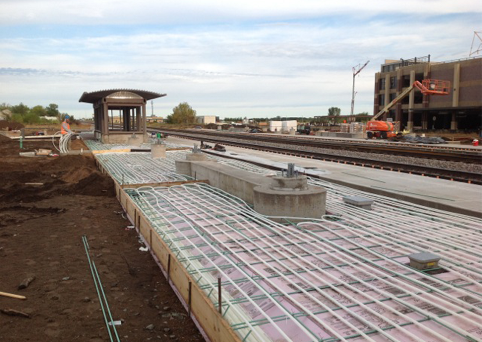 The main station is located in Ramsey, and it consists of two main passenger platforms and a pathway to a large parking garage. Each platform is 425 feet long and 26 feet wide, and crosslinked polyethylene (PEX-a) tubes are embedded in the platforms with a snowmelt system from Uponor to keep riders safe from slipping in the icy and snowy Minnesota winter weather.