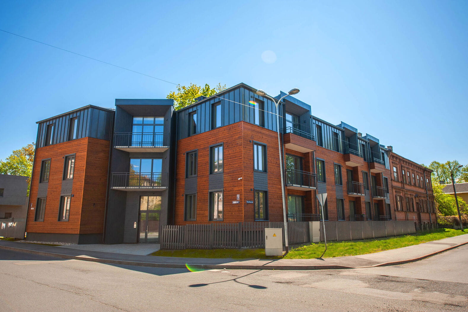 The building is a modern 3-storey stone residential house with natural wood finish. The building has eighteen 2-4 room apartments with quality finishing. On the top floor of the building, the height of the apartment ceiling reaches 3.2 m. Each apartment has a balcony or terrace. A place to experience the unique feeling of Agenskalns, which is typical for the inhabitants of this quiet part of Riga. Harmony in the rhythm of the city. This is the first Hepsor project in Latvia.