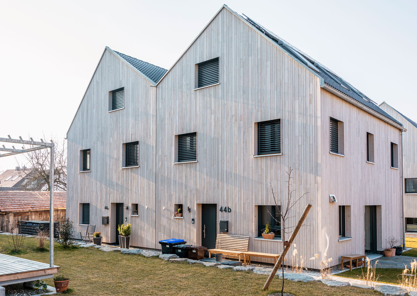 One of the greenest residential neighbourhoods in Europe has now been created. The "Living in Allensbach" residential complex consists of twelve semi-detached houses and two apartment blocks with a living space of around 2,470 square metres. The façades are visually striking - pre-grey silver fir from the Black Forest forms the outer skin of the buildings, which are made of solid wood. For the general contractor Kaufmannbau GmbH, the realisation of the property represented a very special challenge.