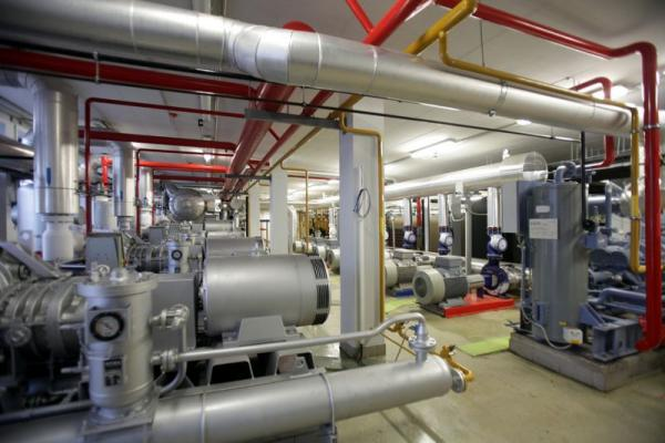 The city municipality and the National Development Agency signed the support agreement for the renovation of the Skating-rink of Városliget, and the attached building blocks, on December 15, 2008. In the framework of the renovation, besides the reconstruction of the ice-rink and the receiving building, they re-build the side-wing which was bombed down in WW II. Out of the almost 4.7 billion HUF development cost, 3.175 billion HUF was made available from EU subsidy. The work was done in two phases. In Phase I, the construction of the new cooling power-house was completed, while in Phase II complete renovation of the monument skating house and the construction of the skating-rink and ice-hockey rink was completed. After the full reconstruction, the Skating-rink of Városliget became the largest open-air skating-rink of Europe, which also meets the requirements of the Association. The surface of the rink is 14,800 m2, it is open from mid-October to mid-March. Maximum cooling power demand is 4.5 MW, built-in nominal cooling power is 5 MW. The rink pipes, fastened to a steel reinforcement net at a clearance of 80 mm, are made from cross-linked PEX pipes (Uponor product), the total length is 198 km. Phase II of the full reconstruction, the complete renovation of the monument skating house and the construction of the skating-rink and ice-hockey rink started in the summer of 2010. The work started with build-down of the building to its skeleton, removal of the 3 layers of pipes below each other, and transportation, crushing, grinding, and re-using of the removed concrete. Then the soil of the rink was replaced and layers were built along with covered tunnel (which is under water in summer). On the lower layer of concrete, insulation, fastening layer with the steel pipe holders, and then the PEX cooling pipes were installed. Pipes were installed 80 mm from each other, fastened to the steel structure by plastic clamps. After laying down the pipes, pressure test was carried out, then the concrete layer was poured, maintaining 2 bar pressure in the pipes. The slope of the rink is less, than 30 mm, waviness of the concrete is below 6 mm. This provides for the uniform thickness and high quality of the ice. Rink pipes are connected to the manifolds in the pipe drift with Rosex disconnectable connections. Installation was carried out under supervision and with consultation from the supplier Uponor. At the skating-rink supply and drain manifolds are placed on opposite sides, while at the ice-hockey rink manifolds are on the same side in the pipe drift. The skating-rink is divided into six sections, each section may be disconnected from the cooling system, while the ice-hockey rink can only be operated in full. In the pipe drift, which starts from the power-house, and can be walked around, special HDPE (special polyethylene) Uponor pipes are connected with manifolds to the main pipelines. Rink pipes are connected to these pipes by disconnectable connections. The skating-rink re-opened after a two-year hiatus in December 2011, and between January 6 and 8, 2012 the International Speed Skating Association organized the complex European Championships, with great success.