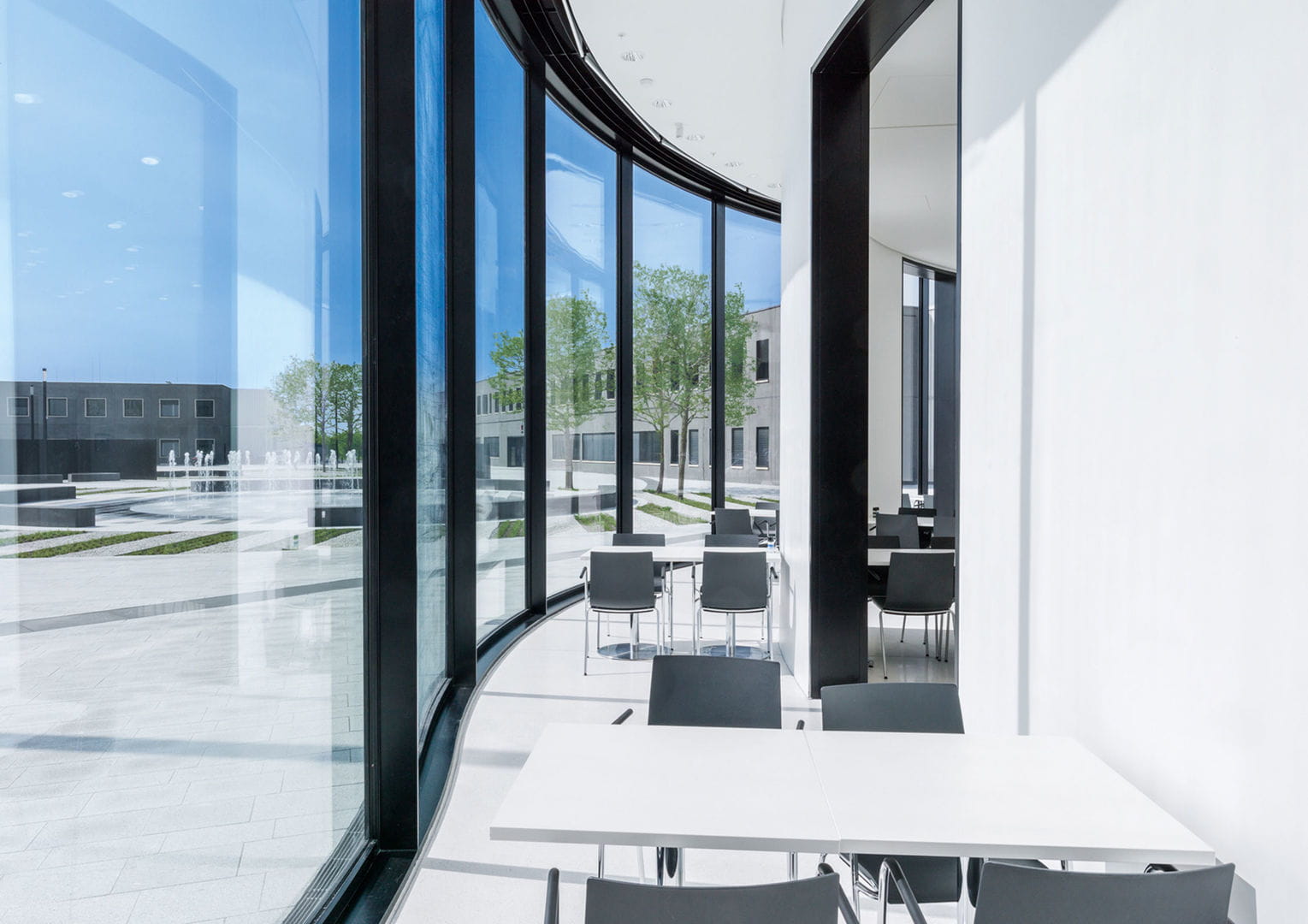 Concrete walls are set behind the floor-to-ceiling glass elements of the gallery on the ground floor and use Zent-Frenger Batiso active mass cooling. In addition, the temperature of the floor of the gallery is controlled using Uponor underfloor heating.